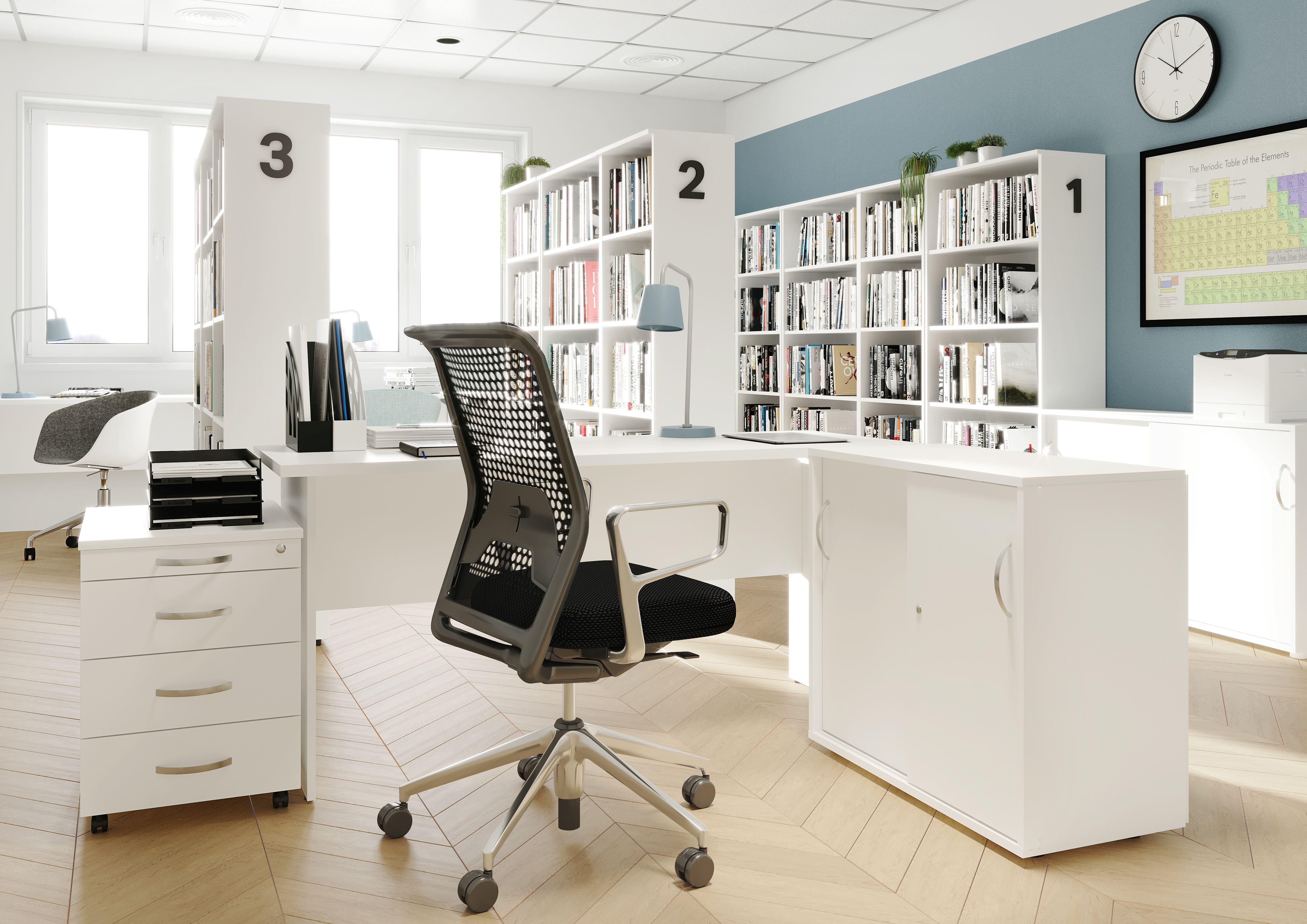 A fehér színváltozat új dimenziókat nyit a belsőépítészeti lehetőségek terén. Ezzel a letisztult, modern megjelenéssel bármilyen tér fiatalos és elegáns stílust ölthet. Visszafogott, sötétebb színekkel és fém kiegészítőkkel kombinálva elegáns hatást érhetünk el, ha pedig élénk színű kiegészítőkkel ötvözzük, vidám és energiával teli irodai környezetet hozhatunk létre. A skandináv stílus szerelmesei is tökéletes alapot kapnak a fehér bútorokkal: lágy pasztell vagy natúr színekkel kiegészítve meleg és barátságos lesz az eredmény.