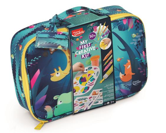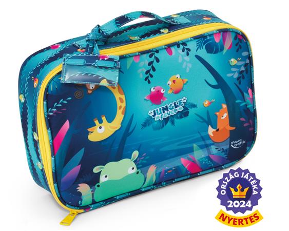 Az dzsungel mintás textilbőrönd vastag filctollakat, színes ceruzákat, gyurmát, ujjfestéket, zsírkrétát, nyomdát rejt, amik a kis kezeknek tökéletesek. A gyerekek kedvük szerint válthatnak egyik kézműves tevékenységről a másikra, több mint 50 kreatív szabadidős eszközt használva. Ebben a divatos kisbőröndben bárhová magukkal vihetik a kedvenc eszközeiket, akár még az uzsonnájuk is belefér. A bőröndön névjegytartó is található, így biztosan nem veszítik el.