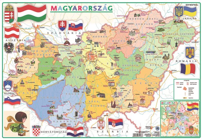 A legkisebbeknek készült az új kétoldalas Magyarország térkép, mely csak az alsó tagozatosok számára szükséges információkat tartalmazza. A Magyarország közigazgatását ábrázoló térkép a megyék és a fontos nagyvárosok feltüntetése mellett, a jellegzetes épületek rajzaival megismerésre ösztönzi a gyermekeket vagy emlékezteti őket a családi kirándulásokon látott szépségekre. Az alátét hátoldalán Magyarország színes vaktérképe látható, így kikérdezhetők az előoldalon látottak.