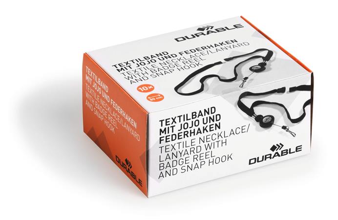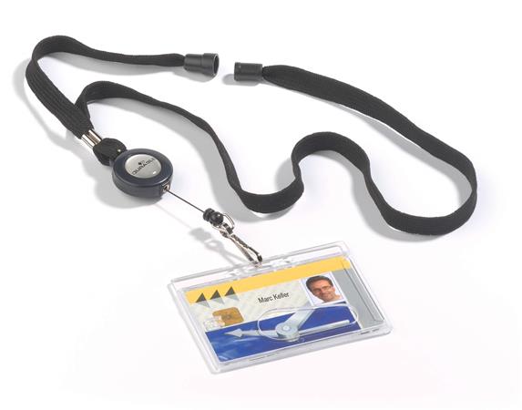 Azonosítókártya-tartó, kihúzható, karabineres, fekete nyakba akasztóval, DURABLE