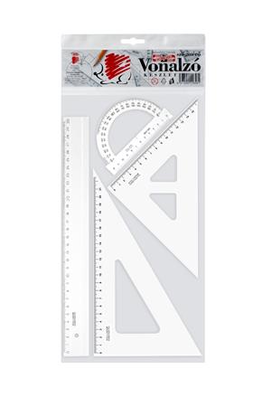 tartalma: 30 cm egyenes-, 45°-os és 60°-os háromszög vonalzó, 180°-os szögmérő.