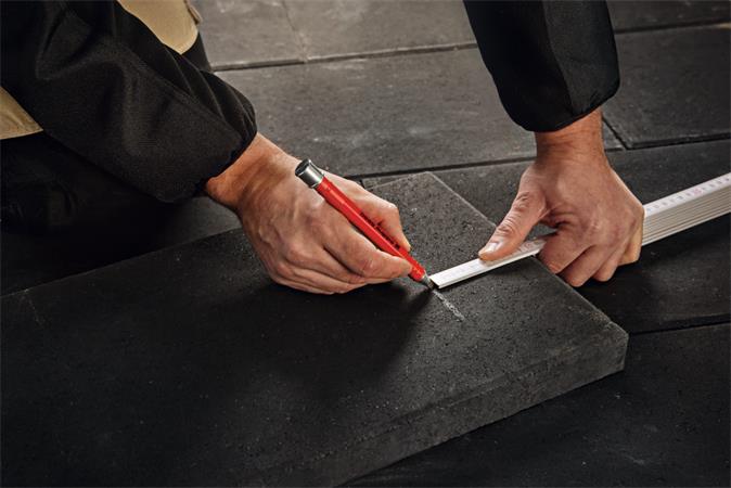 Mechanikus ácsceruza praktikus védő tokban különböző felületek, mint pl. fa, karton, kő vagy beton jelölésére.