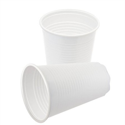 Egyszer használatos fehér műanyag pohár.