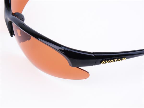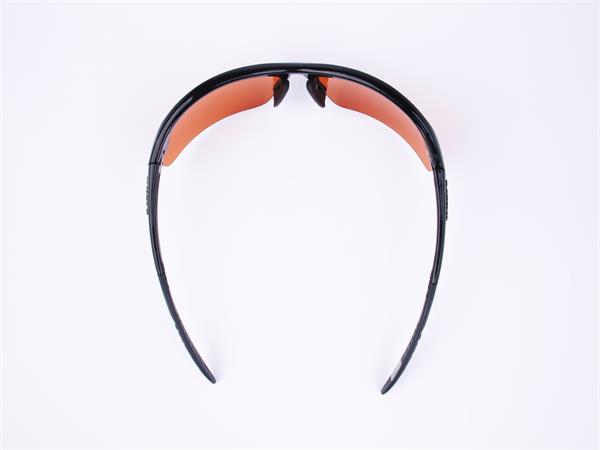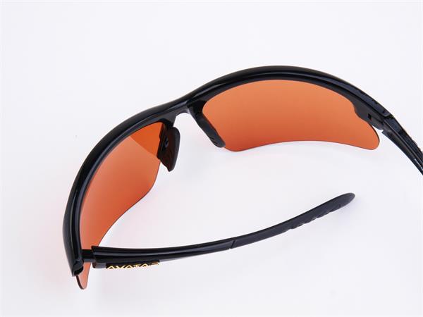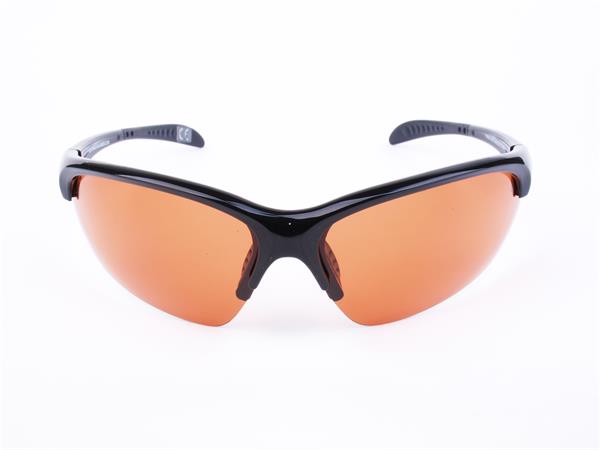 Sportnapszemüveg borostyánszínű HD és polarizált lencsével, fekete műanyag kerettel.