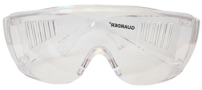 UV védelemmel ellátott polikarbonát védőszemüveg víztiszta lencsékkel. Korrekciós szemüveg felett is viselhető.